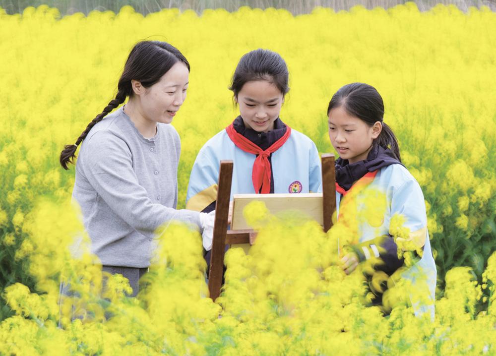 4月1日,江苏省泰州市姜堰区溱潼中心小学的学生在美术老师的指导下进行绘画写生。 春假期间,同学们走出课堂,在丰富多彩的实践活动中拓宽眼界,度过健康快乐、富有收获的假期。新华社发(周社根 摄)